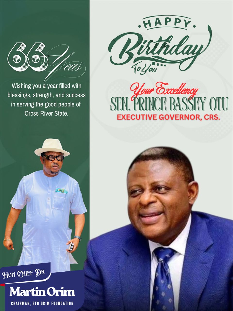 The Chairman of the GFO Orim Foundation and Member of Council, Federal College of Education (Technical), Bichi, Kano State, Hon. Chief (Dr.) Martin Orim, has extended warm felicitations to the Executive Governor of Cross River State, His Excellency, Senator Prince Bassey Edet Otu, on the occasion of his 66th birthday anniversary.