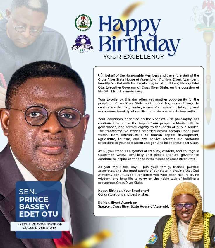 The Speaker of the Cross River State House of Assembly, Rt. Hon. Elvert Ayambem, has extended heartfelt congratulations to the Executive Governor of Cross River State, His Excellency Senator Prince Bassey Edet Otu, on the occasion of his 66th birthday.