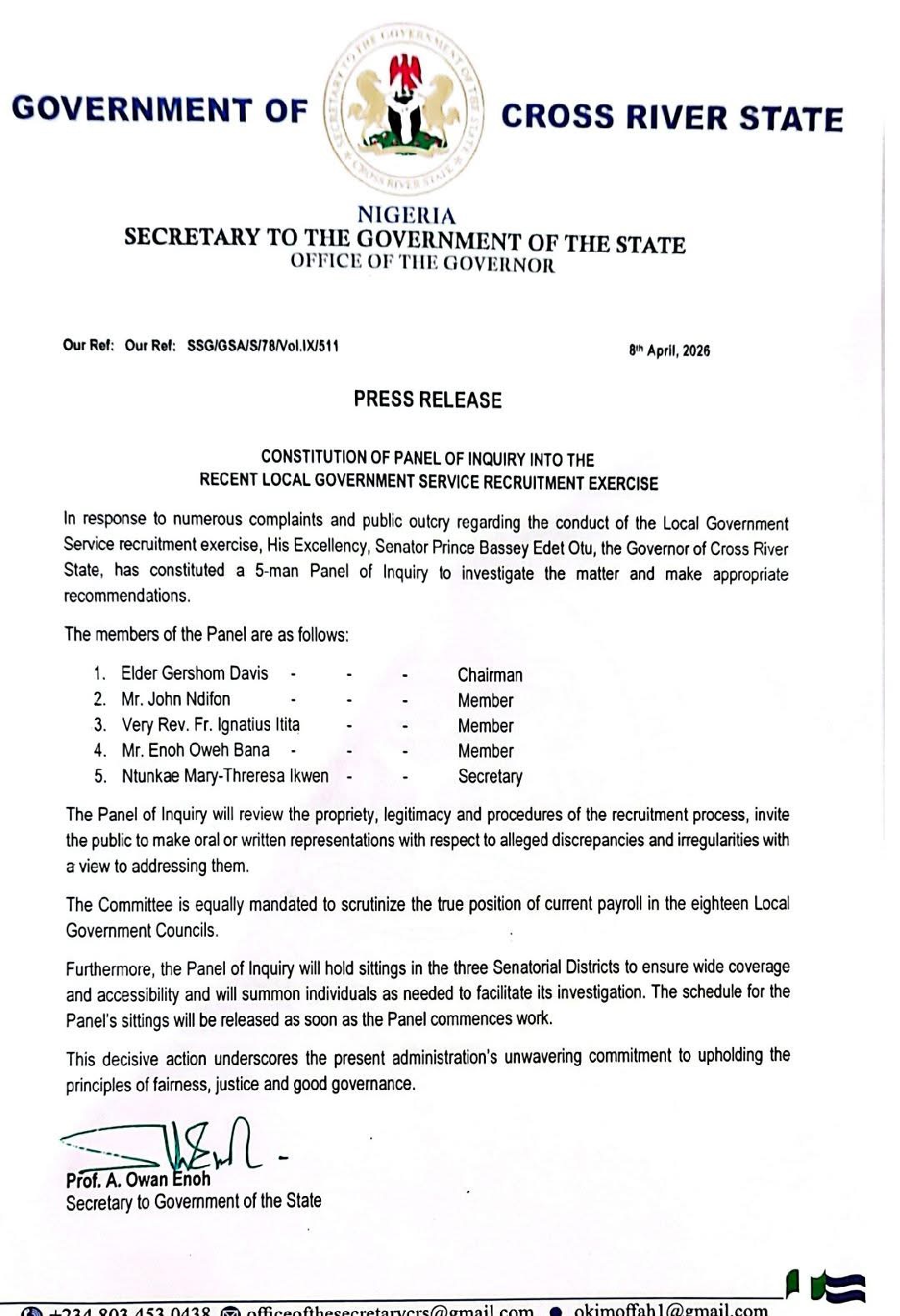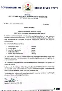 In a press release dated April 8, 2026, and signed by the Secretary to the State Government, Prof. A. Owan Enoh, the government announced the constitution of a five-member Panel of Inquiry to examine the conduct of the recruitment process and make appropriate recommendations.